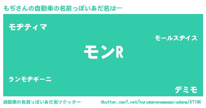 もぢさんの自動車の名前っぽいあだ名は… 『モンR』『モヂティマ』『デミモ』 ツクッター #自動車の名前っぽいあだ名ツクッター http://tkutter.nan7.net/kurumanonamaepoiadana/67196/