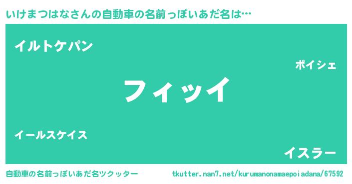 いけまつはなさんの自動車の名前っぽいあだ名は… 『フィッイ』『イルトケパン』『イスラー』 ツクッター #自動車の名前っぽいあだ名ツクッター http://tkutter.nan7.net/kurumanonamaepoiadana/67592/