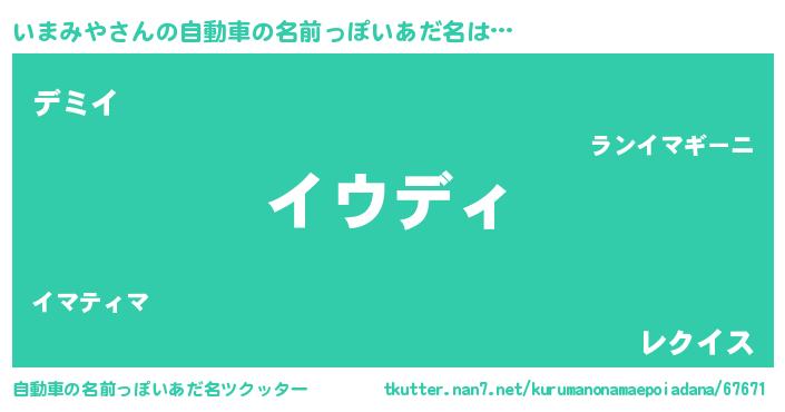 いまみやさんの自動車の名前っぽいあだ名は… 『イウディ』『デミイ』『レクイス』 ツクッター #自動車の名前っぽいあだ名ツクッター http://tkutter.nan7.net/kurumanonamaepoiadana/67671/