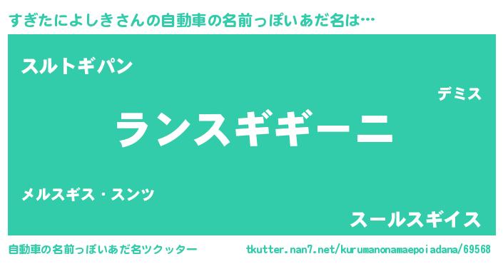 すぎたによしきさんの自動車の名前っぽいあだ名は… 『ランスギギーニ』『スルトギパン』『スールスギイス』 ツクッター #自動車の名前っぽいあだ名ツクッター http://tkutter.nan7.net/kurumanonamaepoiadana/69568/
