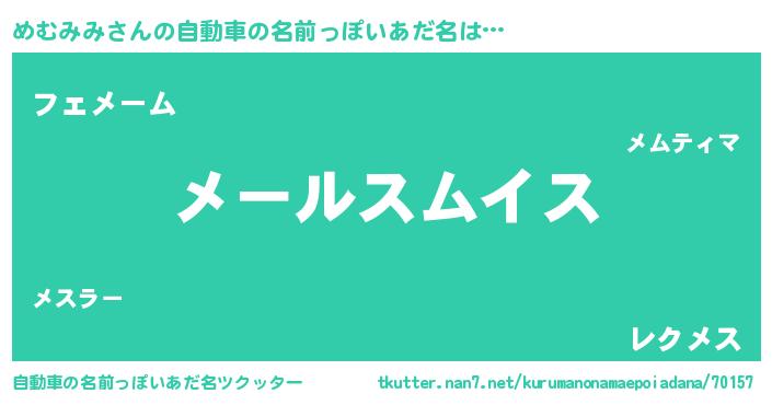 | 男性向けラノベタイトル風あだ名 | 『めむみみ~年齢イコール彼女いない歴の魔法使い~』 |
