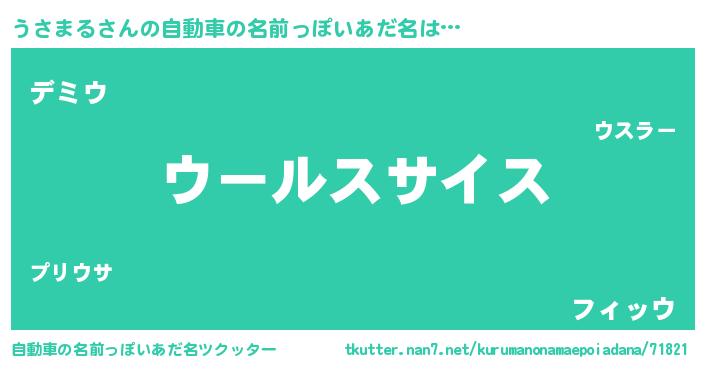 うさまるさんの自動車の名前っぽいあだ名は… 『ウールスサイス』『デミウ』『フィッウ』 ツクッター #自動車の名前っぽいあだ名ツクッター http://tkutter.nan7.net/kurumanonamaepoiadana/71821/