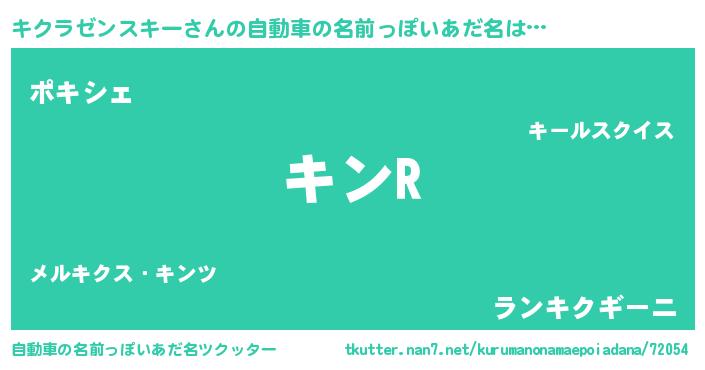 キクラゼンスキーさんの自動車の名前っぽいあだ名は… 『キンR』『ポキシェ』『ランキクギーニ』 ツクッター #自動車の名前っぽいあだ名ツクッター http://tkutter.nan7.net/kurumanonamaepoiadana/72054/