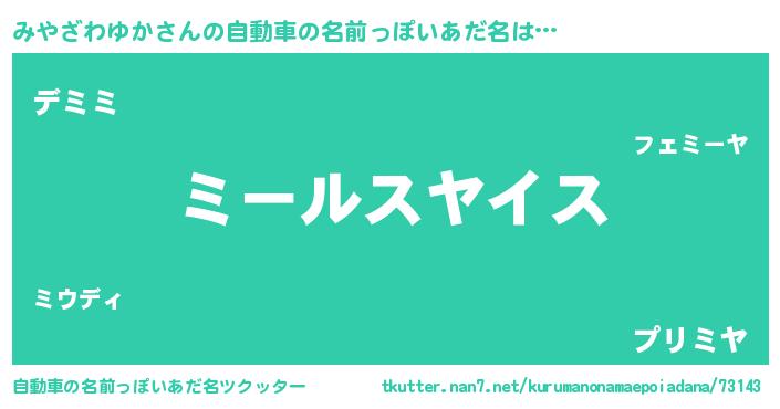 | 男性向けラノベタイトル風あだ名 | 『みやざわゆか~年齢イコール彼女いない歴の魔法使い~』 |