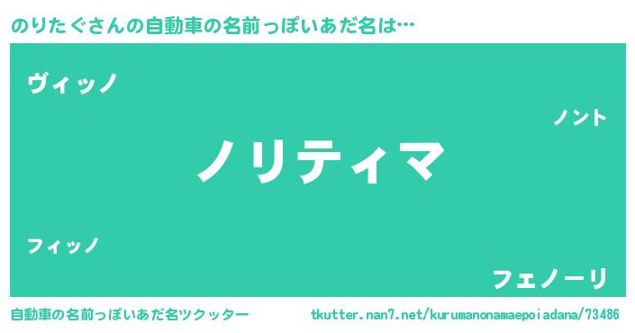 のりたぐさんの自動車の名前っぽいあだ名は… 『ノリティマ』『ヴィッノ』『フェノーリ』 ツクッター #自動車の名前っぽいあだ名ツクッター http://tkutter.nan7.net/kurumanonamaepoiadana/73486/