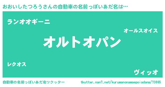 おおいしたつろうさんの自動車の名前っぽいあだ名は… 『オルトオパン』『ランオオギーニ』『ヴィッオ』 ツクッター #自動車の名前っぽいあだ名ツクッター http://tkutter.nan7.net/kurumanonamaepoiadana/73865/