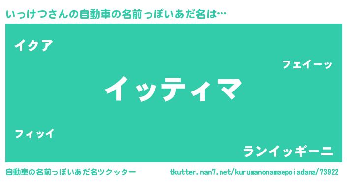 いっけつさんの自動車の名前っぽいあだ名は… 『イッティマ』『イクア』『ランイッギーニ』 ツクッター #自動車の名前っぽいあだ名ツクッター http://tkutter.nan7.net/kurumanonamaepoiadana/73922/