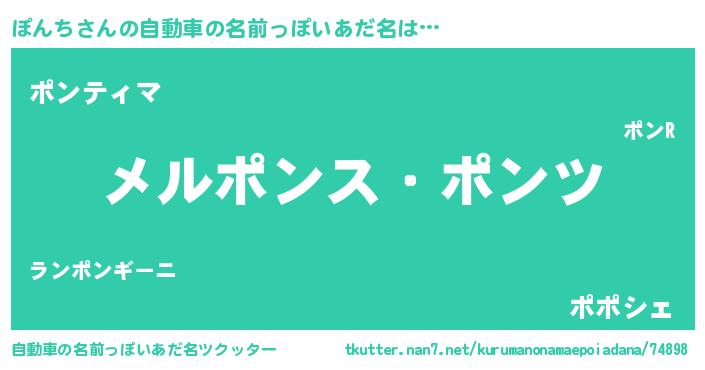 ぽんちさんの自動車の名前っぽいあだ名は… 『メルポンス・ポンツ』『ポンティマ』『ポポシェ』 ツクッター #自動車の名前っぽいあだ名ツクッター http://tkutter.nan7.net/kurumanonamaepoiadana/74898/