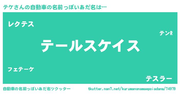 テケさんの自動車の名前っぽいあだ名は… 『テールスケイス』『レクテス』『テスラー』 ツクッター #自動車の名前っぽいあだ名ツクッター http://tkutter.nan7.net/kurumanonamaepoiadana/74979/