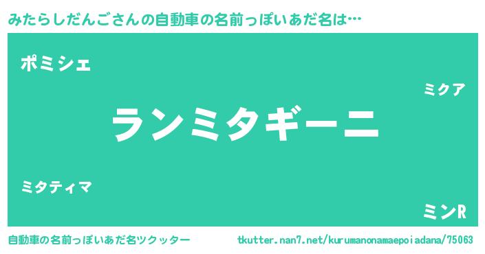 みたらしだんごさんの自動車の名前っぽいあだ名は… 『ランミタギーニ』『ポミシェ』『ミンR』 ツクッター #自動車の名前っぽいあだ名ツクッター http://tkutter.nan7.net/kurumanonamaepoiadana/75063/