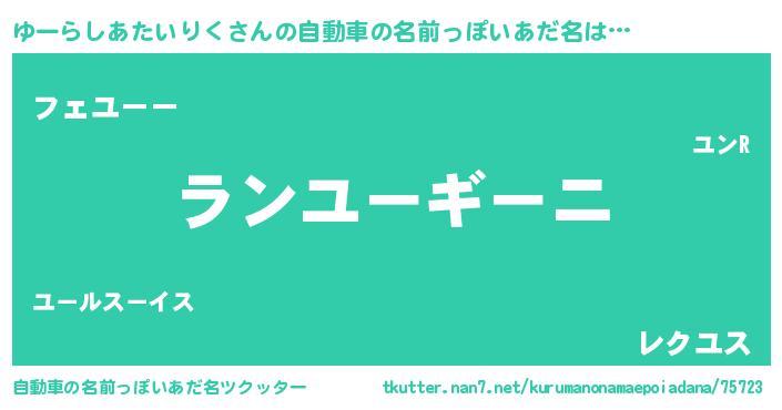 ゆーらしあたいりくさんの自動車の名前っぽいあだ名は… 『ランユーギーニ』『フェユーー』『レクユス』 ツクッター #自動車の名前っぽいあだ名ツクッター http://tkutter.nan7.net/kurumanonamaepoiadana/75723/