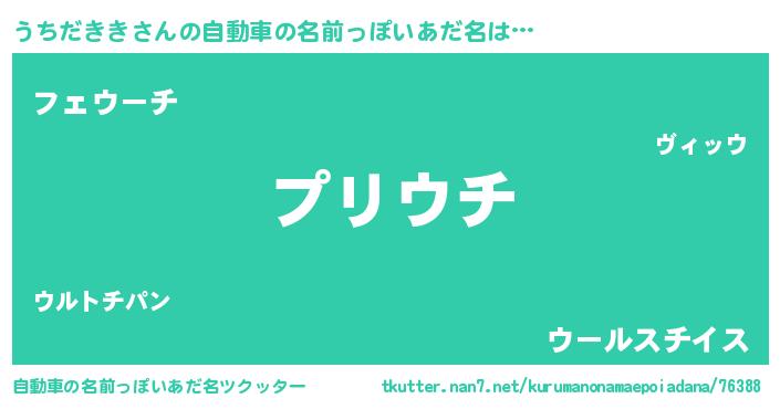 うちだききさんの自動車の名前っぽいあだ名は… 『プリウチ』『フェウーチ』『ウールスチイス』 ツクッター #自動車の名前っぽいあだ名ツクッター http://tkutter.nan7.net/kurumanonamaepoiadana/76388/