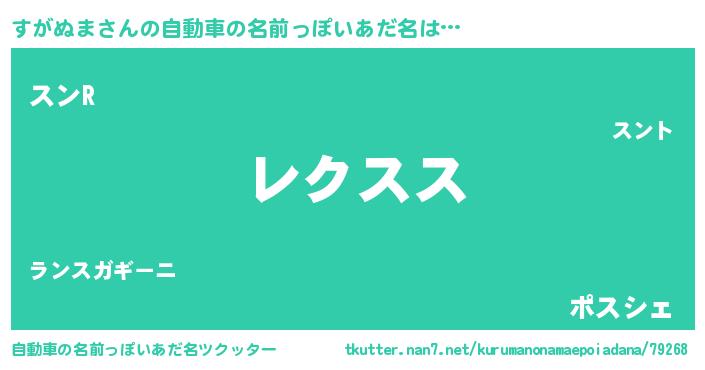 すがぬまさんの自動車の名前っぽいあだ名は… 『レクスス』『スンR』『ポスシェ』 ツクッター #自動車の名前っぽいあだ名ツクッター http://tkutter.nan7.net/kurumanonamaepoiadana/79268/