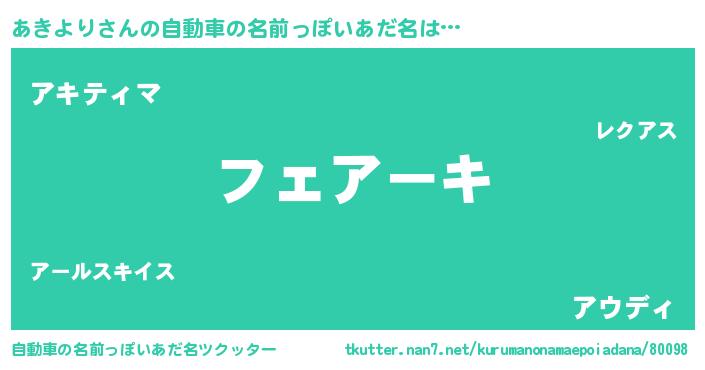 あきよりさんの自動車の名前っぽいあだ名は… 『フェアーキ』『アキティマ』『アウディ』 ツクッター #自動車の名前っぽいあだ名ツクッター http://tkutter.nan7.net/kurumanonamaepoiadana/80098/