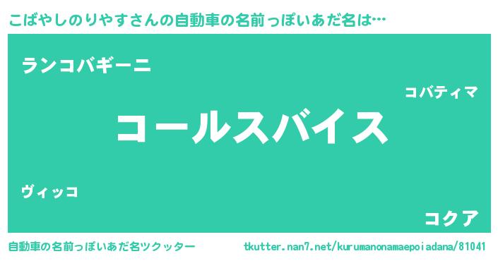 こばやしのりやすさんの自動車の名前っぽいあだ名は… 『コールスバイス』『ランコバギーニ』『コクア』 ツクッター #自動車の名前っぽいあだ名ツクッター http://tkutter.nan7.net/kurumanonamaepoiadana/81041/