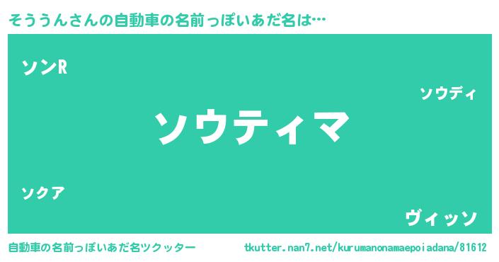 そううんさんの自動車の名前っぽいあだ名は… 『ソウティマ』『ソンR』『ヴィッソ』 ツクッター #自動車の名前っぽいあだ名ツクッター http://tkutter.nan7.net/kurumanonamaepoiadana/81612/