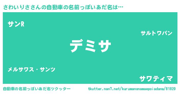 さわいりささんの自動車の名前っぽいあだ名は… 『デミサ』『サンR』『サワティマ』 ツクッター #自動車の名前っぽいあだ名ツクッター http://tkutter.nan7.net/kurumanonamaepoiadana/81820/