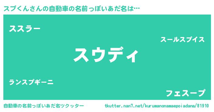 スプくんさんの自動車の名前っぽいあだ名は… 『スウディ』『ススラー』『フェスープ』 ツクッター #自動車の名前っぽいあだ名ツクッター http://tkutter.nan7.net/kurumanonamaepoiadana/81910/