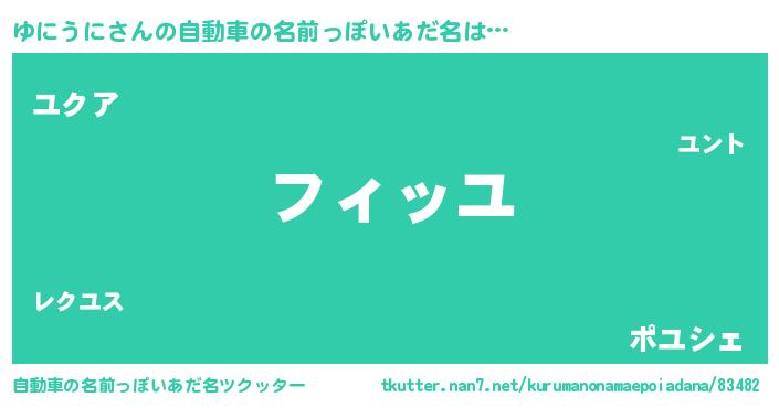 ゆにうにさんの自動車の名前っぽいあだ名は… 『フィッユ』『ユクア』『ポユシェ』 ツクッター #自動車の名前っぽいあだ名ツクッター http://tkutter.nan7.net/kurumanonamaepoiadana/83482/