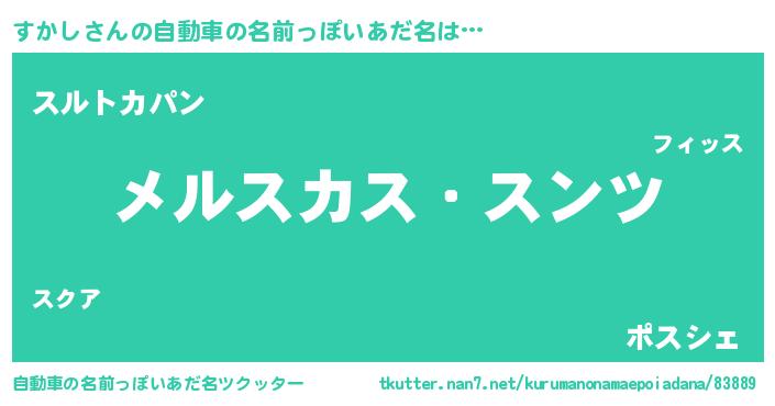 すかしさんの自動車の名前っぽいあだ名は… 『メルスカス・スンツ』『スルトカパン』『ポスシェ』 ツクッター #自動車の名前っぽいあだ名ツクッター http://tkutter.nan7.net/kurumanonamaepoiadana/83889/