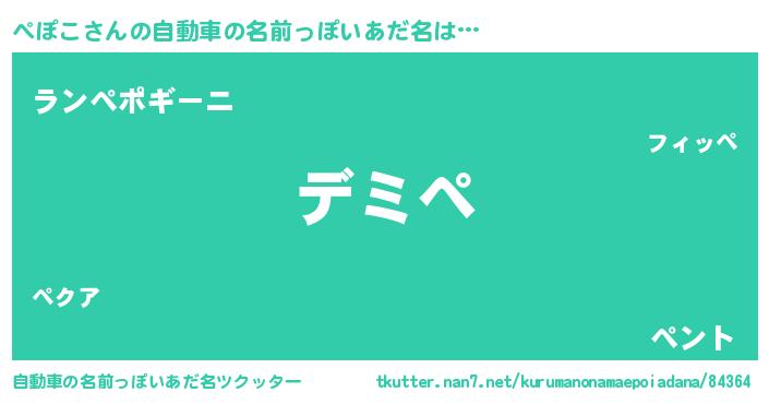 ぺぽこさんの自動車の名前っぽいあだ名は… 『デミペ』『ランペポギーニ』『ペント』 ツクッター #自動車の名前っぽいあだ名ツクッター http://tkutter.nan7.net/kurumanonamaepoiadana/84364/