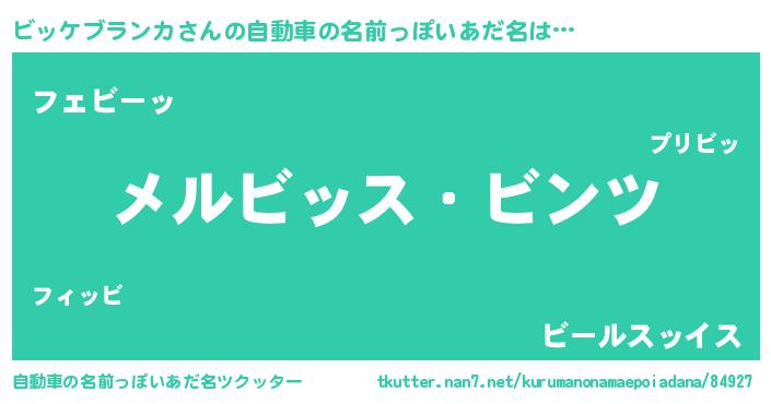 ビッケブランカさんの自動車の名前っぽいあだ名は… 『メルビッス・ビンツ』『フェビーッ』『ビールスッイス』 ツクッター #自動車の名前っぽいあだ名ツクッター http://tkutter.nan7.net/kurumanonamaepoiadana/84927/