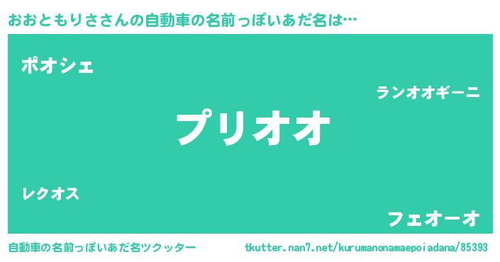 おおともりささんの自動車の名前っぽいあだ名は… 『プリオオ』『ポオシェ』『フェオーオ』 ツクッター #自動車の名前っぽいあだ名ツクッター http://tkutter.nan7.net/kurumanonamaepoiadana/85393/
