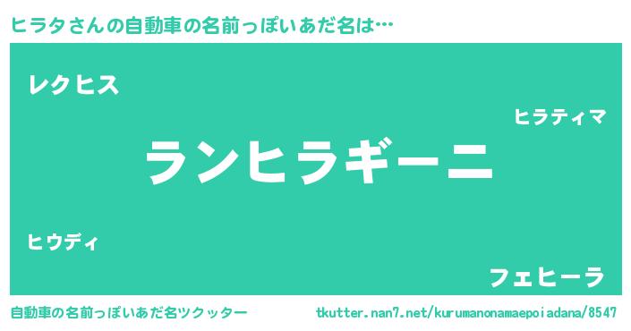 ヒラタさんの自動車の名前っぽいあだ名は… 『ランヒラギーニ』『レクヒス』『フェヒーラ』 ツクッター #自動車の名前っぽいあだ名ツクッター http://tkutter.nan7.net/kurumanonamaepoiadana/8547/