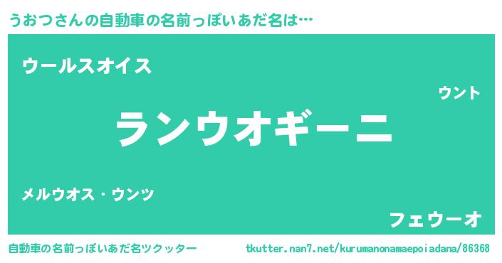 うおつさんの自動車の名前っぽいあだ名は… 『ランウオギーニ』『ウールスオイス』『フェウーオ』 ツクッター #自動車の名前っぽいあだ名ツクッター http://tkutter.nan7.net/kurumanonamaepoiadana/86368/
