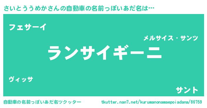 さいとううめかさんの自動車の名前っぽいあだ名は… 『ランサイギーニ』『フェサーイ』『サント』 ツクッター #自動車の名前っぽいあだ名ツクッター http://tkutter.nan7.net/kurumanonamaepoiadana/86759/