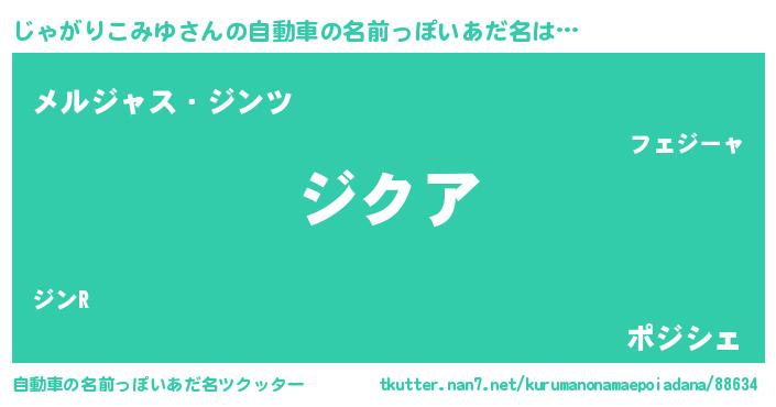 じゃがりこみゆさんの自動車の名前っぽいあだ名は… 『ジクア』『メルジャス・ジンツ』『ポジシェ』 ツクッター #自動車の名前っぽいあだ名ツクッター http://tkutter.nan7.net/kurumanonamaepoiadana/88634/