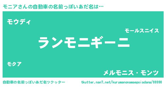 モニアさんの自動車の名前っぽいあだ名は… 『ランモニギーニ』『モウディ』『メルモニス・モンツ』 ツクッター #自動車の名前っぽいあだ名ツクッター http://tkutter.nan7.net/kurumanonamaepoiadana/88990/