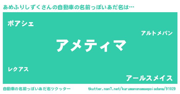 あめふりしずくさんの自動車の名前っぽいあだ名は… 『アメティマ』『ポアシェ』『アールスメイス』 ツクッター #自動車の名前っぽいあだ名ツクッター http://tkutter.nan7.net/kurumanonamaepoiadana/91029/