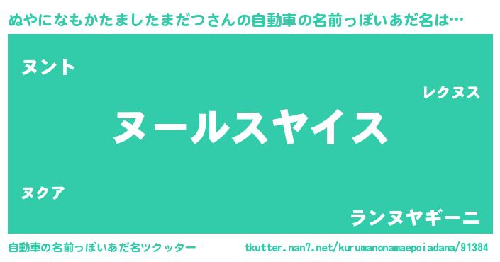 | 男性向けラノベタイトル風あだ名 | 『ヌヤニナモカタマシタマダツスレイヤー』 |