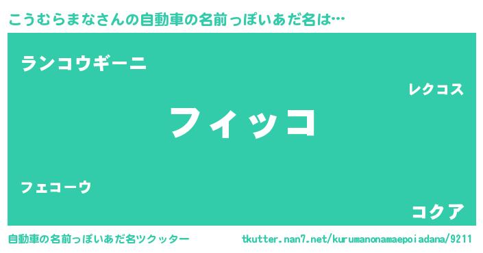 こうむらまなさんの自動車の名前っぽいあだ名は… 『フィッコ』『ランコウギーニ』『コクア』 ツクッター #自動車の名前っぽいあだ名ツクッター http://tkutter.nan7.net/kurumanonamaepoiadana/9211/