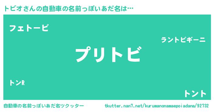 トビオさんの自動車の名前っぽいあだ名は… 『プリトビ』『フェトービ』『トント』 ツクッター #自動車の名前っぽいあだ名ツクッター http://tkutter.nan7.net/kurumanonamaepoiadana/92732/