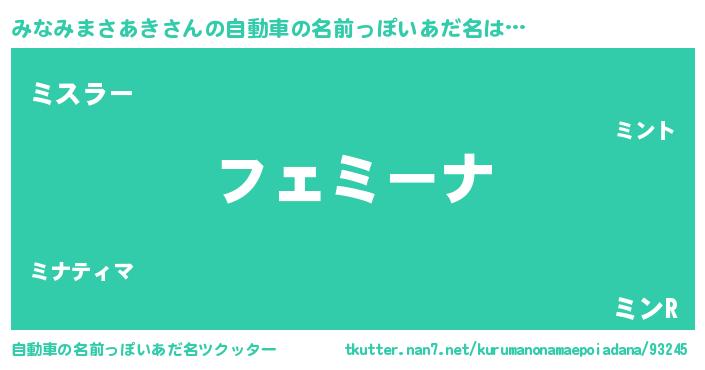 みなみまさあきさんの自動車の名前っぽいあだ名は… 『フェミーナ』『ミスラー』『ミンR』 ツクッター #自動車の名前っぽいあだ名ツクッター http://tkutter.nan7.net/kurumanonamaepoiadana/93245/