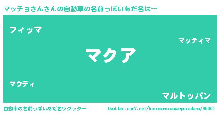マッチョさんさんの自動車の名前っぽいあだ名は… 『マクア』『フィッマ』『マルトッパン』 ツクッター #自動車の名前っぽいあだ名ツクッター http://tkutter.nan7.net/kurumanonamaepoiadana/95060/