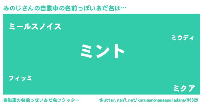 みのじさんの自動車の名前っぽいあだ名は… 『ミント』『ミールスノイス』『ミクア』 ツクッター #自動車の名前っぽいあだ名ツクッター http://tkutter.nan7.net/kurumanonamaepoiadana/96029/