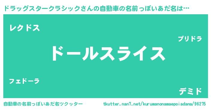 | 女子向けラノベタイトル風あだ名 | 『ドラッグスタークラシックの玉の輿計画!』 |