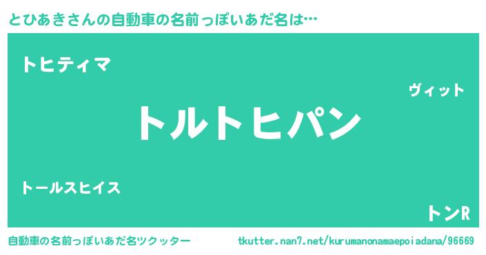 とひあきさんの自動車の名前っぽいあだ名は… 『トルトヒパン』『トヒティマ』『トンR』 ツクッター #自動車の名前っぽいあだ名ツクッター http://tkutter.nan7.net/kurumanonamaepoiadana/96669/
