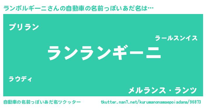 ランボルギーニさんの自動車の名前っぽいあだ名は… 『ランランギーニ』『プリラン』『メルランス・ランツ』 ツクッター #自動車の名前っぽいあだ名ツクッター http://tkutter.nan7.net/kurumanonamaepoiadana/96873/