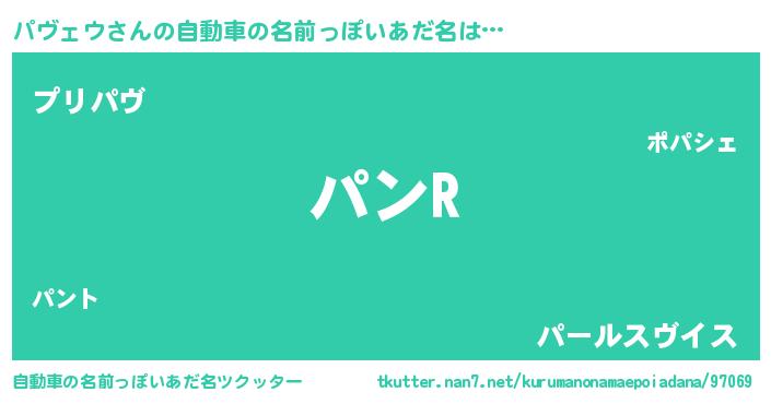 パヴェウさんの自動車の名前っぽいあだ名は… 『パンR』『プリパヴ』『パールスヴイス』 ツクッター #自動車の名前っぽいあだ名ツクッター http://tkutter.nan7.net/kurumanonamaepoiadana/97069/