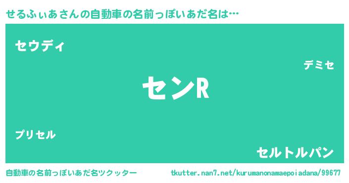 せるふぃあさんの自動車の名前っぽいあだ名は… 『センR』『セウディ』『セルトルパン』 ツクッター #自動車の名前っぽいあだ名ツクッター http://tkutter.nan7.net/kurumanonamaepoiadana/99677/