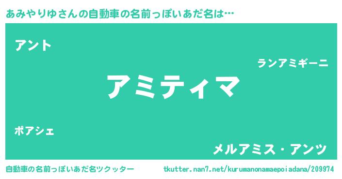 あみやりゆさんの自動車の名前っぽいあだ名は… 『アミティマ』『アント』『メルアミス・アンツ』 ツクッター #自動車の名前っぽいあだ名ツクッター http://tkutter.nan7.net/kurumanonamaepoiadana/209974/