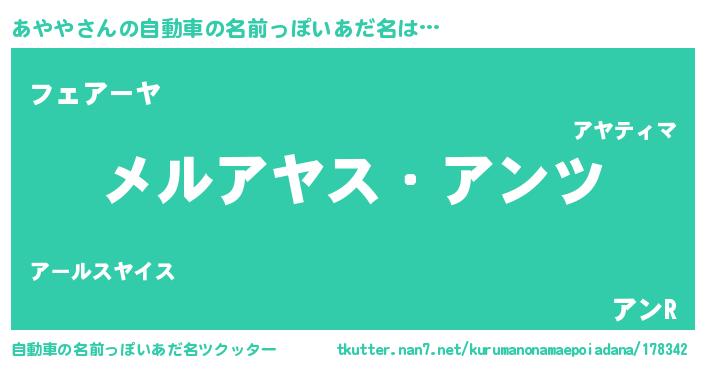 あややさんの自動車の名前っぽいあだ名は… 『メルアヤス・アンツ』『フェアーヤ』『アンR』 ツクッター #自動車の名前っぽいあだ名ツクッター http://tkutter.nan7.net/kurumanonamaepoiadana/178342/