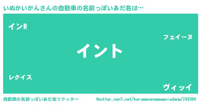 いぬかいかんさんの自動車の名前っぽいあだ名は… 『イント』『インR』『ヴィッイ』 ツクッター #自動車の名前っぽいあだ名ツクッター http://tkutter.nan7.net/kurumanonamaepoiadana/208306/