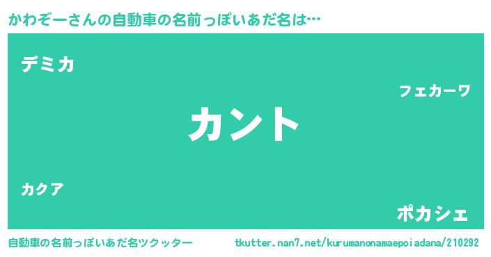 かわぞーさんの自動車の名前っぽいあだ名は… 『カント』『デミカ』『ポカシェ』 ツクッター #自動車の名前っぽいあだ名ツクッター http://tkutter.nan7.net/kurumanonamaepoiadana/210292/