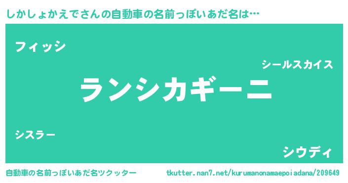 しかしょかえでさんの自動車の名前っぽいあだ名は… 『ランシカギーニ』『フィッシ』『シウディ』 ツクッター #自動車の名前っぽいあだ名ツクッター http://tkutter.nan7.net/kurumanonamaepoiadana/209649/