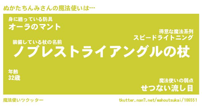 | 男性向けラノベタイトル風あだ名 | 『ヌカタチンミアートオンライン』 |